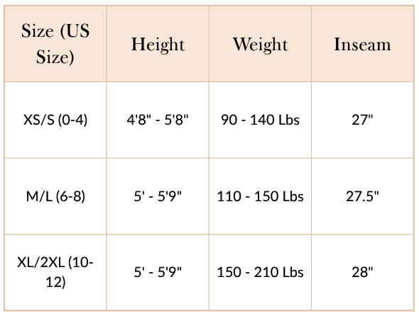All sizes are ranges as our tights are stretchy, therefore, fit may vary depending on individual body composition.